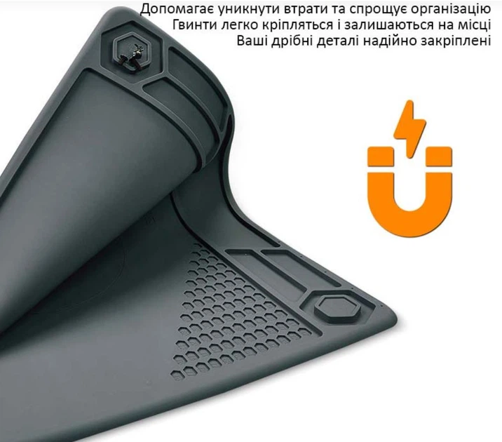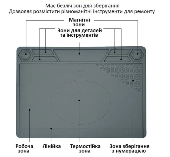Силіконовий термостійкий коврик призначений для паяння, ремонту електроніки та обслуговування техніки. Забезпечує захист робочої поверхні від високих температур, механічних пошкоджень та забруднень. Підходити для використання у сервісних центрах та домашніх майстернях. Коврик виготовлений із термостійкого силікону, стійкого до деформації при нагріванні. Має протиковзку поверхню, бортики по периметру та функціональні зони для розміщення інструментів та дрібних компонентів. Вбудована розмітка дозволяє виконувати вимірювання без додаткових інструментів. Матеріал легко очищується від залишків флюсу, припою та інших забруднень. Коврик можна згортати для зручного зберігання та транспортування.